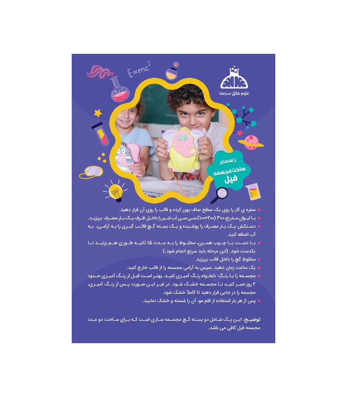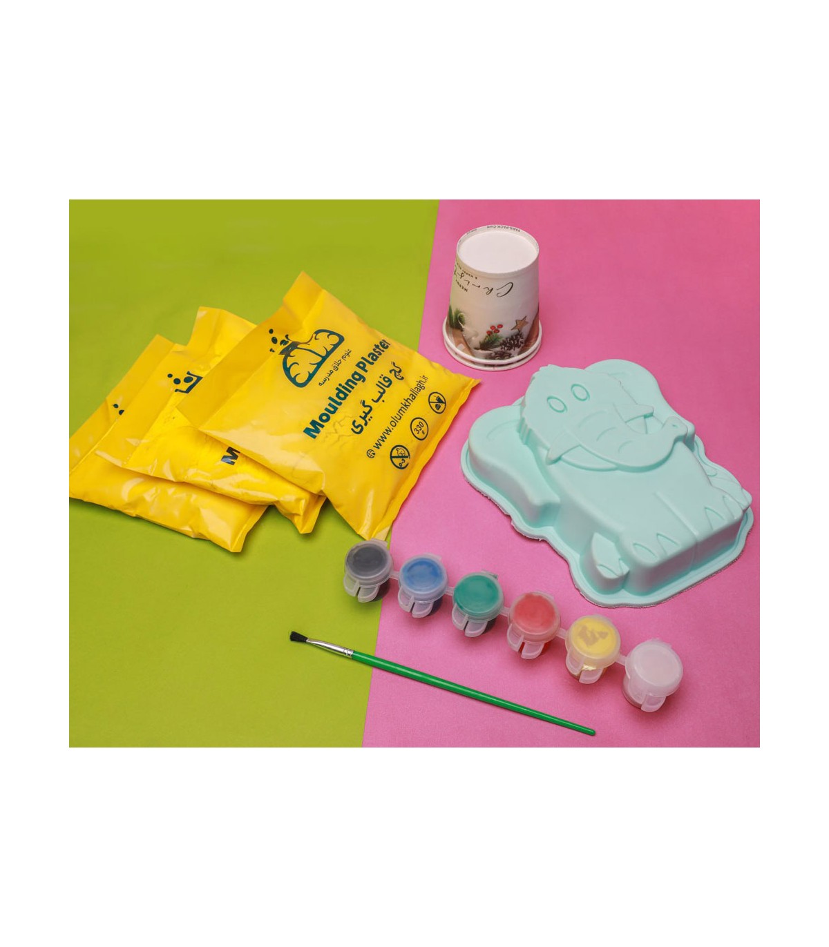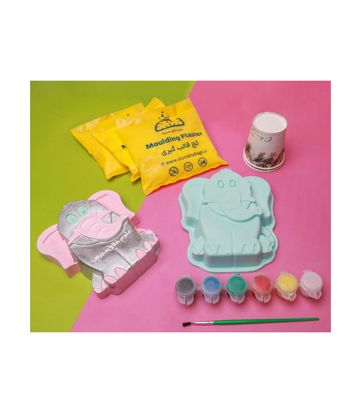 -محتویات:قالب طرح فیل، دو بسته گچ مجسمه سازی، 4 عدد گواش، قلم مو، دستکش، لیوان مدرج  یک بار مصرف، سفره ی کار و دستورالعمل  مجسمه سازی با قالب، برای کودکان یک تجربه جدید و خلاقانه است. کودک  با ریختن پودر گچ مجسمه سازی در آب، مخلوط را آماده و داخل قالب می ریزد و پس از یک ساعت، مجسمه فیل را از قالب خارج می کند.با محتویات این بسته، کودک می تواند 2 عدد مجسمه فیل ساخته و رنگ آمیزی کند.قالب موجود در بسته، از جنس سیلیکون بوده و کودکان می توانند با تهیه بسته های گچ مجسمه سازی علوم خلاق، تعداد زیادی مجسمه بسازند.